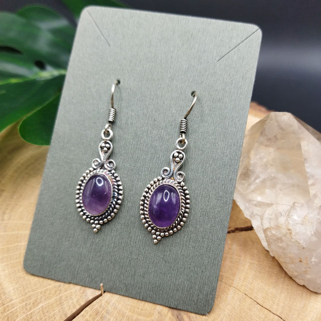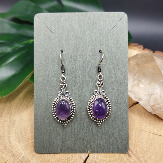 Magnifiques boucles d'oreilles en Améthyste et Argent 925 pour femme. Très bel artisanat indien, en direct du Rajasthan. Hauteur motif : 3.2cm x 2.2cm. Hauteur totale avec attaches : 4.8cm