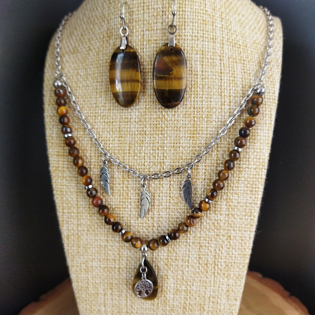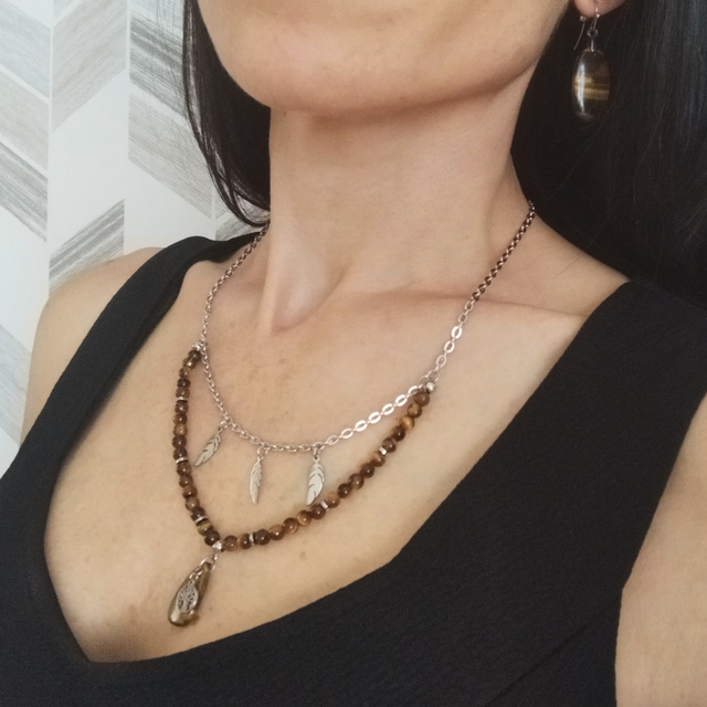 Collier double en Œil de tigre et acier inoxydable pour femme. Longueur totale 54cm (pendentif compris). Boucles d'oreilles vendues séparément.