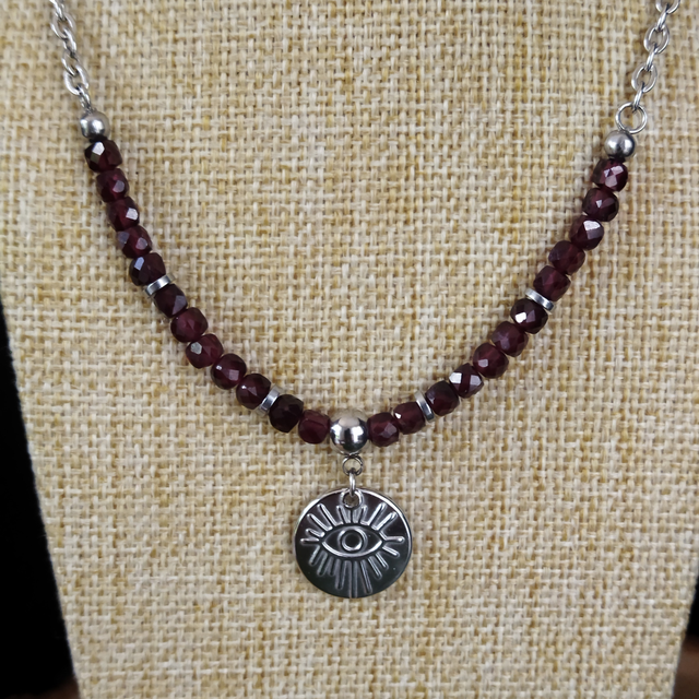Collier ras de cou en Grenat et acier inoxydable pour femme. Pendentif en acier inoxydable (Possibilité de choisir un autre motif). Longueur 39.5cm. Possibilité de rallonger. Mise à taille gratuite (indiquer longueur souhaitée lors de la commande).