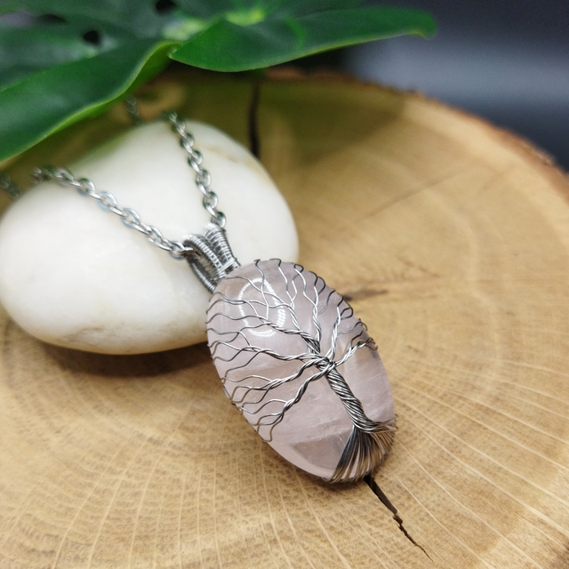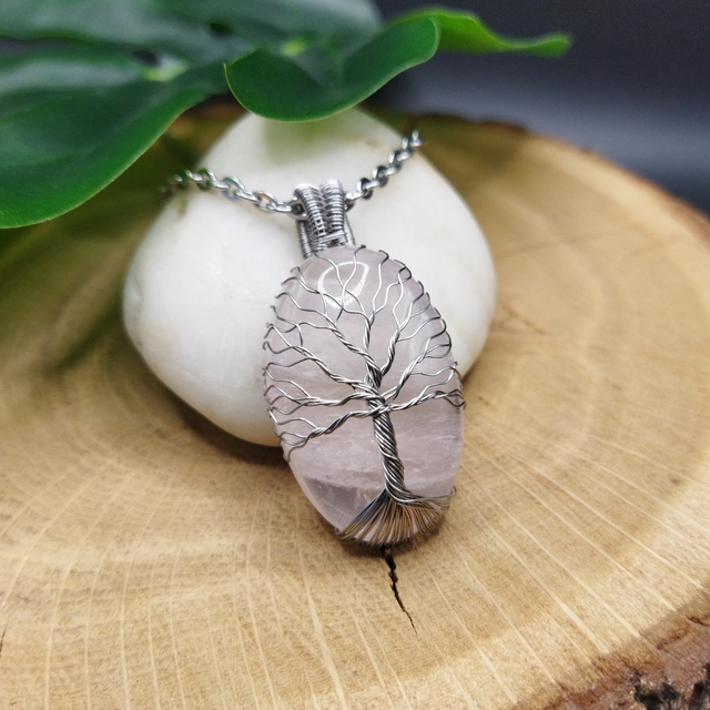 Pendentif Arbre de vie en Quartz rose et acier inoxydable pour femme. Réalisé entièrement à la main, sans colle ni soudure. L'acier inoxydable est un matériau très solide et qui ne ternit pas. Dimensions 5.2cm x 3cm. Inclus : chaîne acier inoxydable.