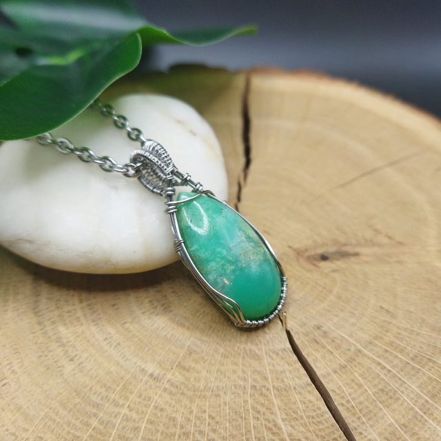 Pendentif en Chrysoprase (qualité rare) et acier inoxydable pour femme. Réalisé entièrement à la main, sans colle ni soudure. L'acier inoxydable est un matériau très solide et qui ne ternit pas. Dimensions 4.1cm x 1.6cm. Inclus : chaîne acier inoxydable.
