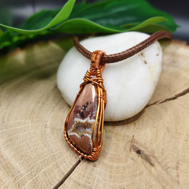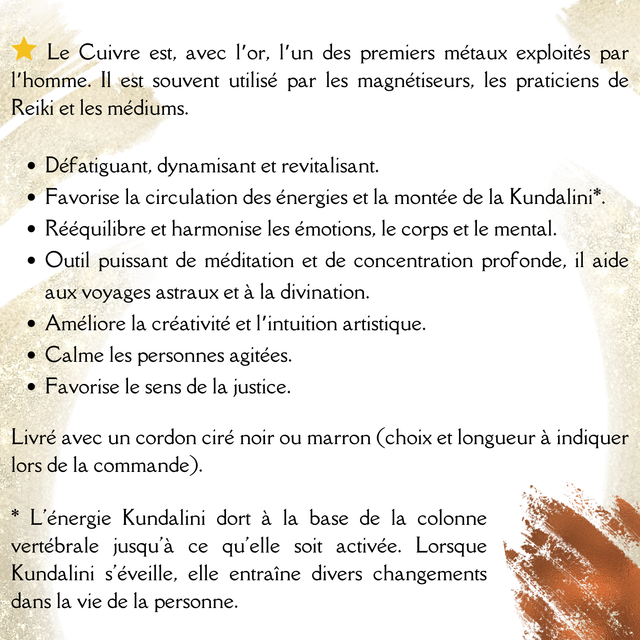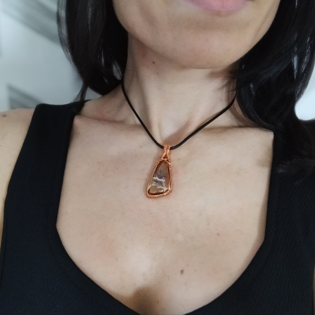 Pendentif en Cuivre natif et fil de cuivre anti-ternissement pour femme. Réalisé entièrement à la main, sans colle ni soudure. Dimension : 4.5cm x 1.8cm. Inclus : cordon ciré noir ou marron.