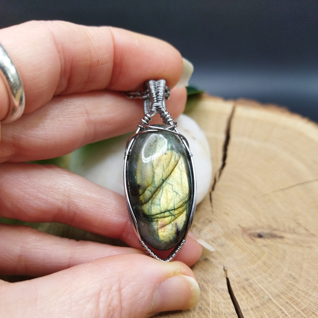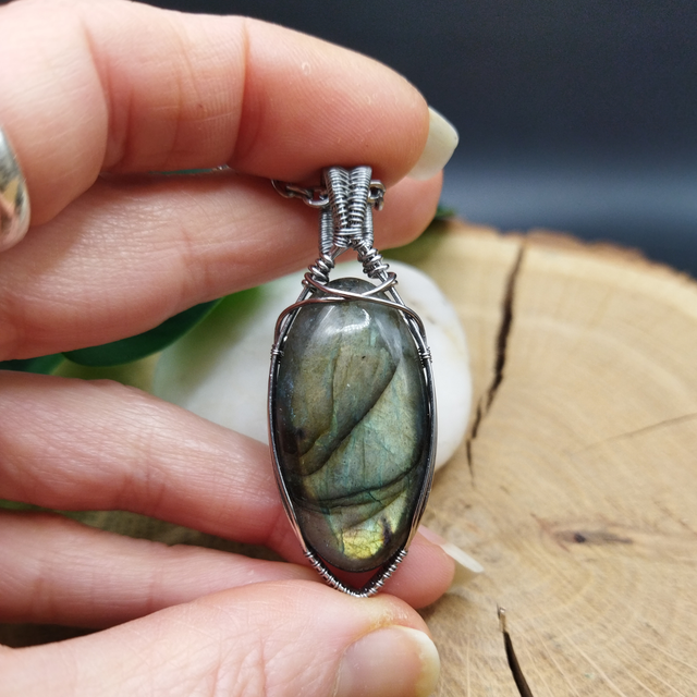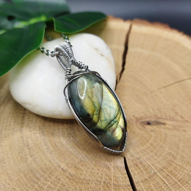Pendentif en Labradorite et acier inoxydable pour homme ou femme. Réalisé entièrement à la main, sans colle ni soudure. L'acier inoxydable est un matériau très solide et qui ne ternit pas. Dimension : 5.3cm x 2cm. Inclus : chaîne acier inoxydable ou cordon ciré noir.