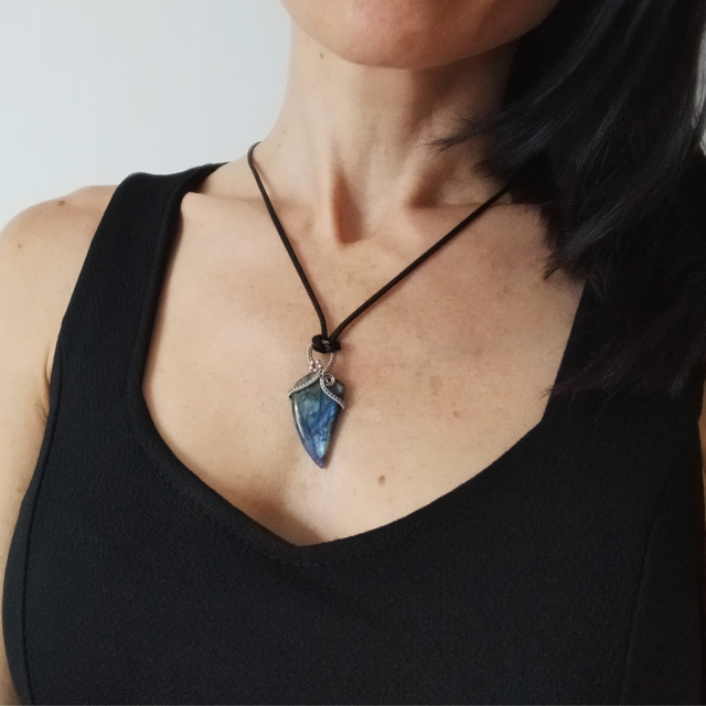 Pendentif en Labradorite et acier inoxydable pour homme ou femme. Réalisé entièrement à la main, sans colle ni soudure. L'acier inoxydable est un matériau très solide et qui ne ternit pas. Dimension : 4.6cm x 2.1cm. Inclus, chaîne acier inoxydable ou cordon ciré noir.