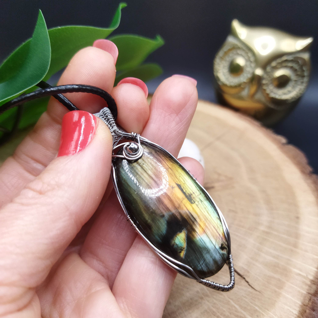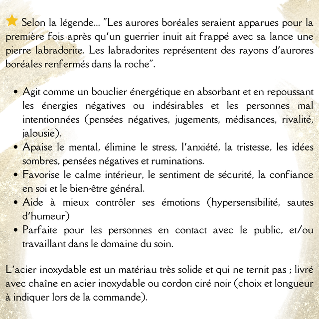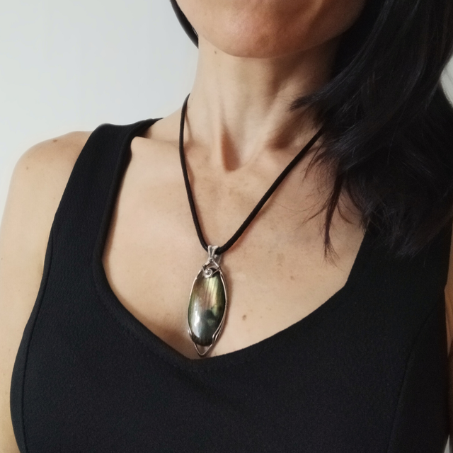 Pendentif en Labradorite et acier inoxydable pour femme. Réalisé entièrement à la main, sans colle ni soudure. L'acier inoxydable est un matériau très solide et qui ne ternit pas. Dimensions : 6.3cm x 2.7cm. Inclus : cordon ciré noir.