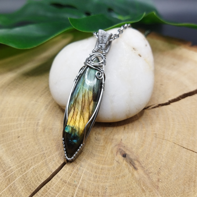 Pendentif en Labradorite et acier inoxydable pour femme. Réalisé entièrement à la main, sans colle ni soudure. L'acier inoxydable est un matériau très solide et qui ne ternit pas. Dimension : 5.9cm x 1.4cm. Inclus : chaîne acier inoxydable ou cordon ciré noir.