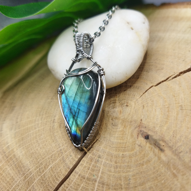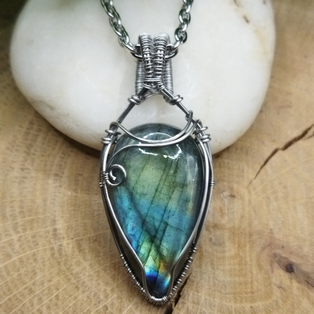 Pendentif en Labradorite et acier inoxydable pour femme. Réalisé entièrement à la main, sans colle ni soudure. L'acier inoxydable est un matériau très solide et qui ne ternit pas. Dimension : 4cm x 1.7cm. Inclus : chaîne acier inoxydable.