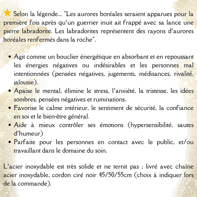 Pendentif en Labradorite bleue et acier inoxydable pour femme. Réalisé entièrement à la main, sans colle ni soudure. L'acier inoxydable est un matériau très solide et qui ne ternit pas. Dimensions : 4.3cm x 2.4cm. Inclus : chaîne acier inoxydable.