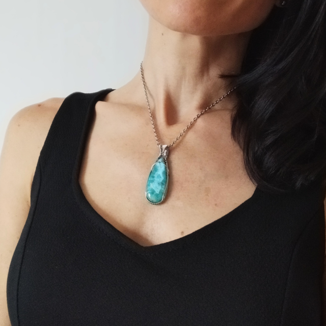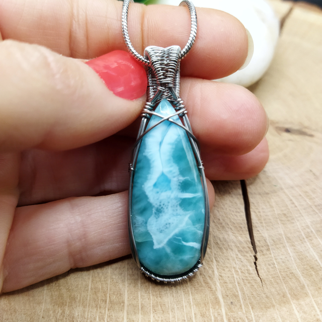 Pendentif en Larimar et acier inoxydable pour femme. Réalisé entièrement à la main, sans colle ni soudure. L'acier inoxydable est un matériau très solide et qui ne ternit pas. Dimensions : 5.1cm x 1.8cm. Inclus : chaîne acier inoxydable.