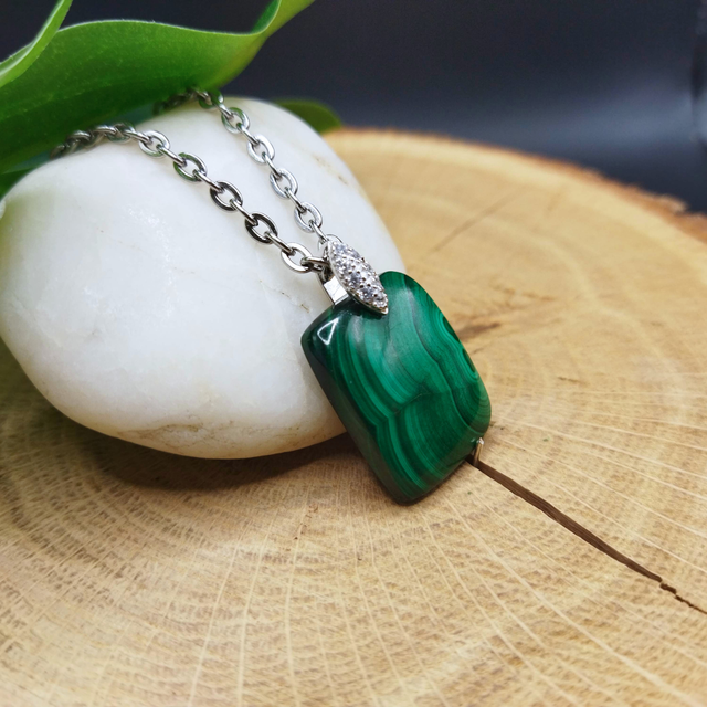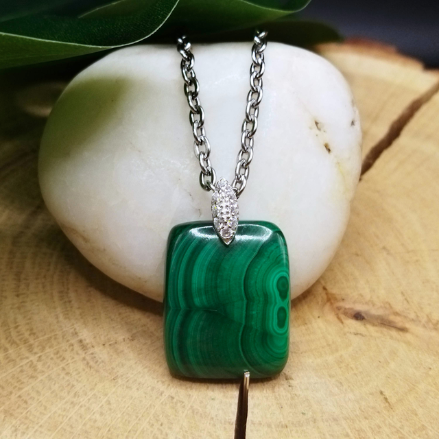 Pendentif en Malachite et bélière en argent 925 incrustée de strass pour femme. Dimensions : 3cm x 1.9cm