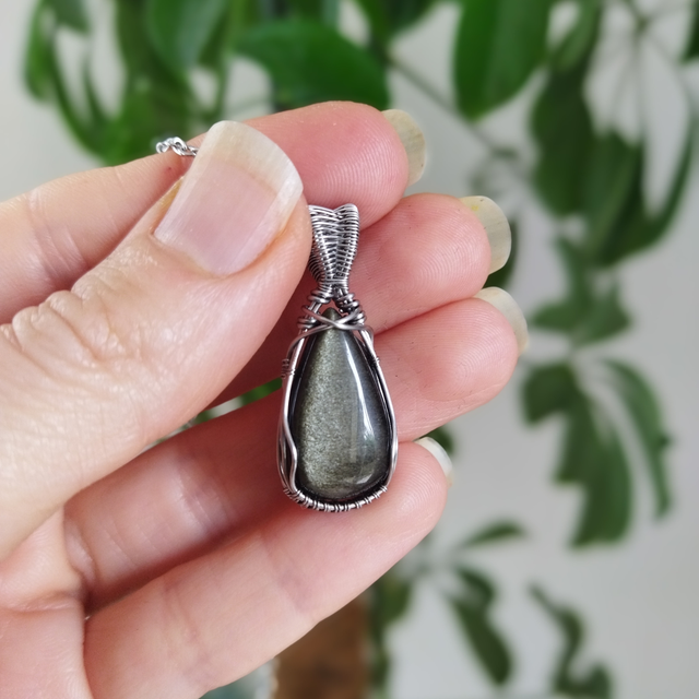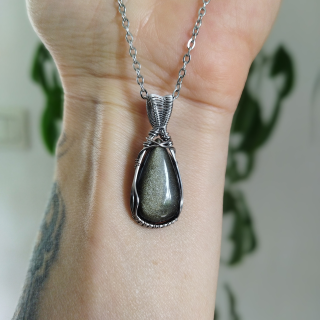 Pendentif taille mini en Obsidienne Dorée et acier inoxydable pour femme. Belle couleur dorée bien visible, très rare en taille si petite. Réalisé entièrement à la main, sans colle ni soudure. L'acier inoxydable est un matériau très solide et qui ne ternit pas. Dimension : 3.6cm x 1.5cm. Inclus : chaîne acier inoxydable.