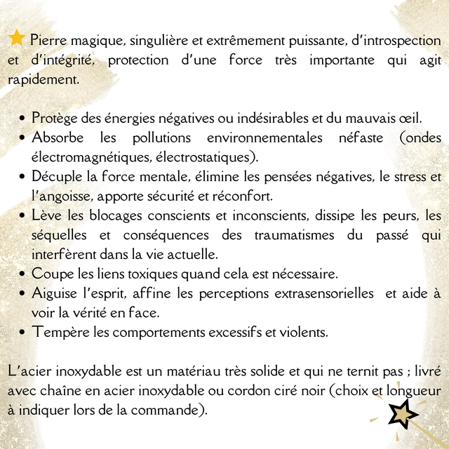 Pendentif en Obsidienne Midnight Lace (ou d'Arménie) et acier inoxydable pour femme. Réalisé entièrement à la main, sans colle ni soudure. L'acier inoxydable est un matériau très solide et qui ne ternit pas. Dimension : 4.8cm x 2.1cm. Inclus : chaîne acier inoxydable ou cordon ciré noir.