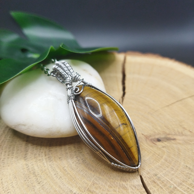 Pendentif en Œil de tigre et acier inoxydable pour femme. Réalisé entièrement à la main, sans colle ni soudure. L'acier inoxydable est un matériau très solide et qui ne ternit pas. Dimension : 5.9cm x 2.3cm. Inclus : chaîne acier inoxydable ou cordon noir ou marron.