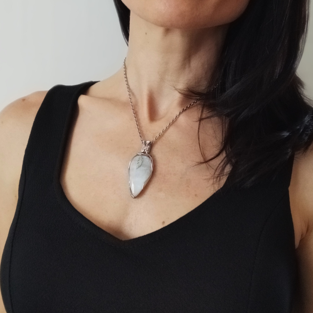 Pendentif en Péristérite (souvent appelée Pierre de Lune) et acier inoxydable pour femme. Réalisé entièrement à la main, sans colle ni soudure. L'acier inoxydable est un matériau très solide et qui ne ternit pas. Dimension : 5.3cm x 2.3cm. Inclus : chaîne acier inoxydable.