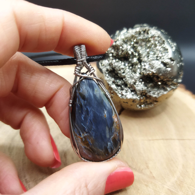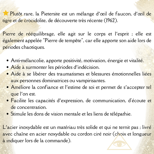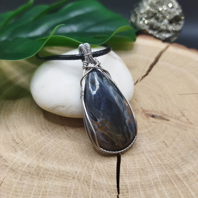 Pendentif en Piétersite et acier inoxydable pour homme ou femme. Réalisé entièrement à la main, sans colle ni soudure. L'acier inoxydable est un matériau très solide et qui ne ternit pas. Dimension : 5cm x 2.2cm. Inclus : chaîne acier inoxydable ou cordon ciré noir.