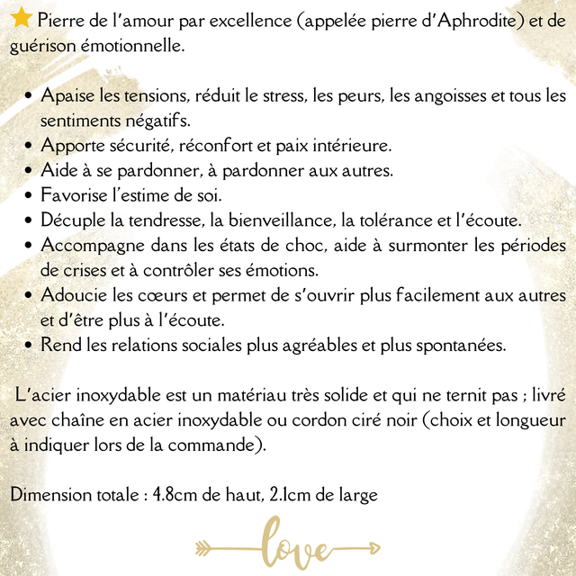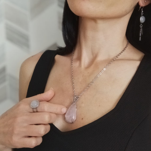 Pendentif en Quartz rose et acier inoxydable pour femme. Réalisé entièrement à la main, sans colle ni soudure. L'acier inoxydable est un matériau très solide et qui ne ternit pas. Dimension : 4.8cm x 2.1cm. Inclus : chaîne acier inoxydable.