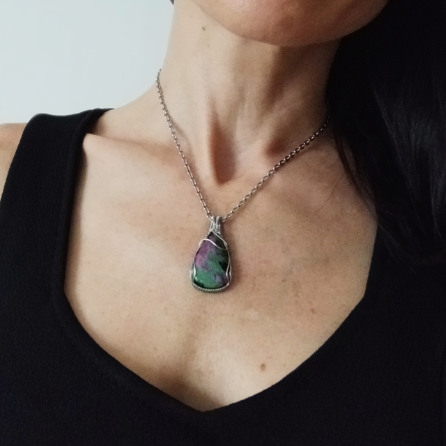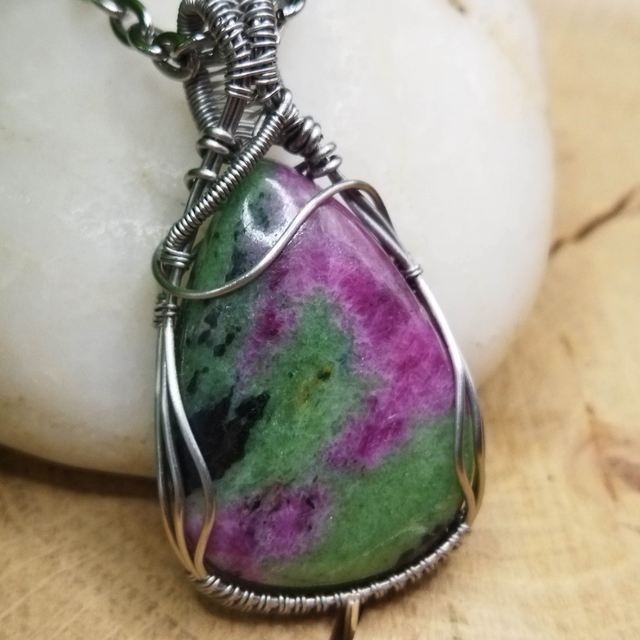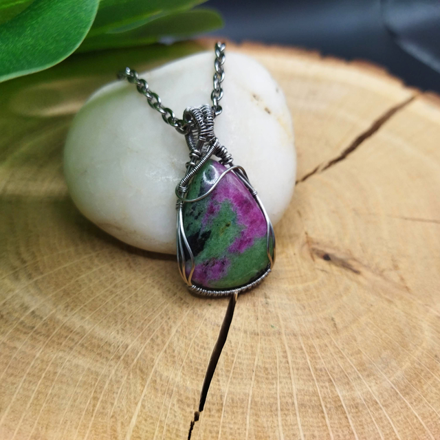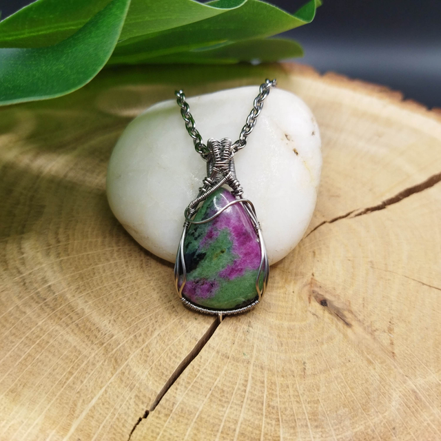 Pendentif en Rubis Zoïsite et acier inoxydable pour femme. Réalisé entièrement à la main, sans colle ni soudure. L'acier inoxydable est un matériau très solide et qui ne ternit pas. Dimension : 3.8cm x 2.1cm. Inclus : chaîne acier inoxydable.