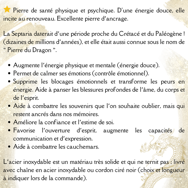 Pendentif en Septaria du Maroc pour homme ou femme. Réalisé entièrement à la main, sans colle ni soudure. L'acier inoxydable est un matériau très solide et qui ne ternit pas. Dimension : 5.6cm x 2.6cm. Inclus : chaîne acier inoxydable ou cordon ciré noir.
