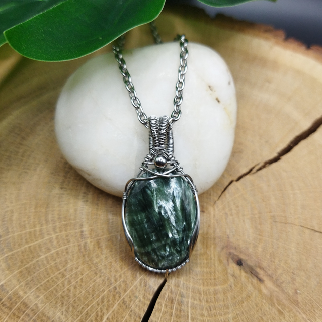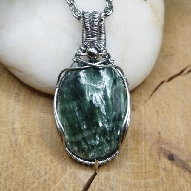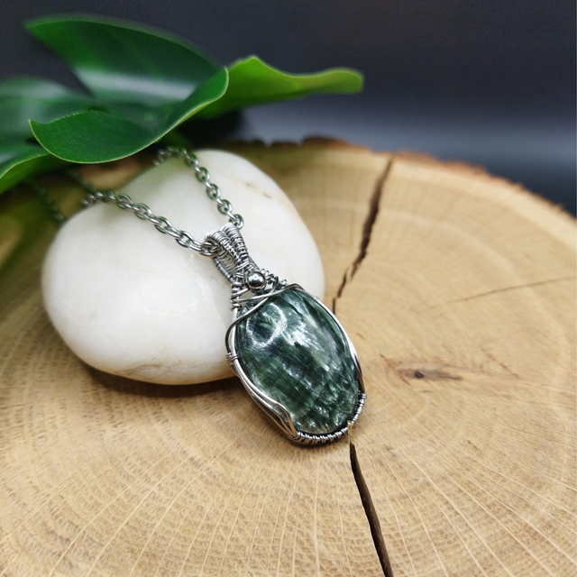 Pendentif en Séraphinite et acier inoxydable pour femme. Réalisé entièrement à la main, sans colle ni soudure. L'acier inoxydable est un matériau très solide et qui ne ternit pas. Dimensions : 4.1cm x 2cm. Inclus : chaîne acier inoxydable ou cordon ciré noir.